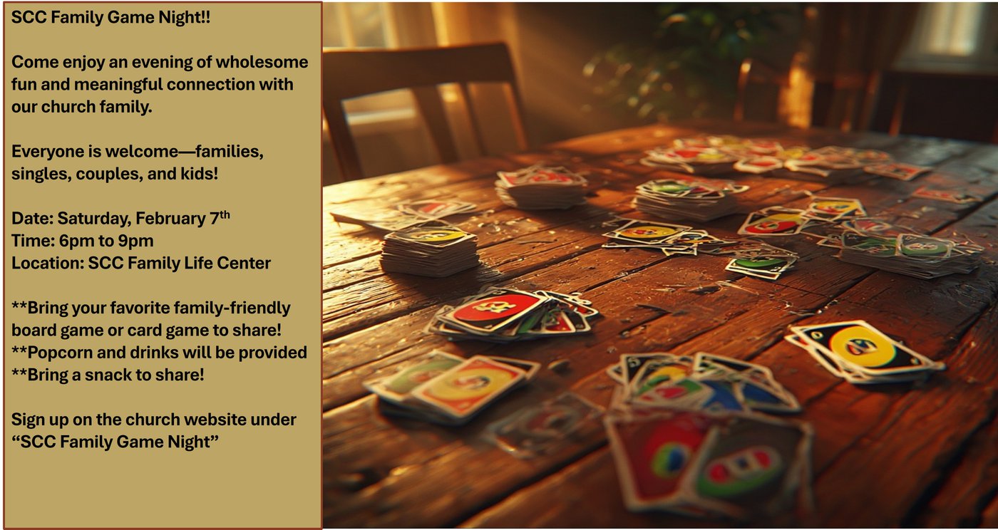 Come enjoy an evening of wholesome fun and meaningful connection with our church family.